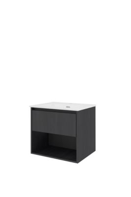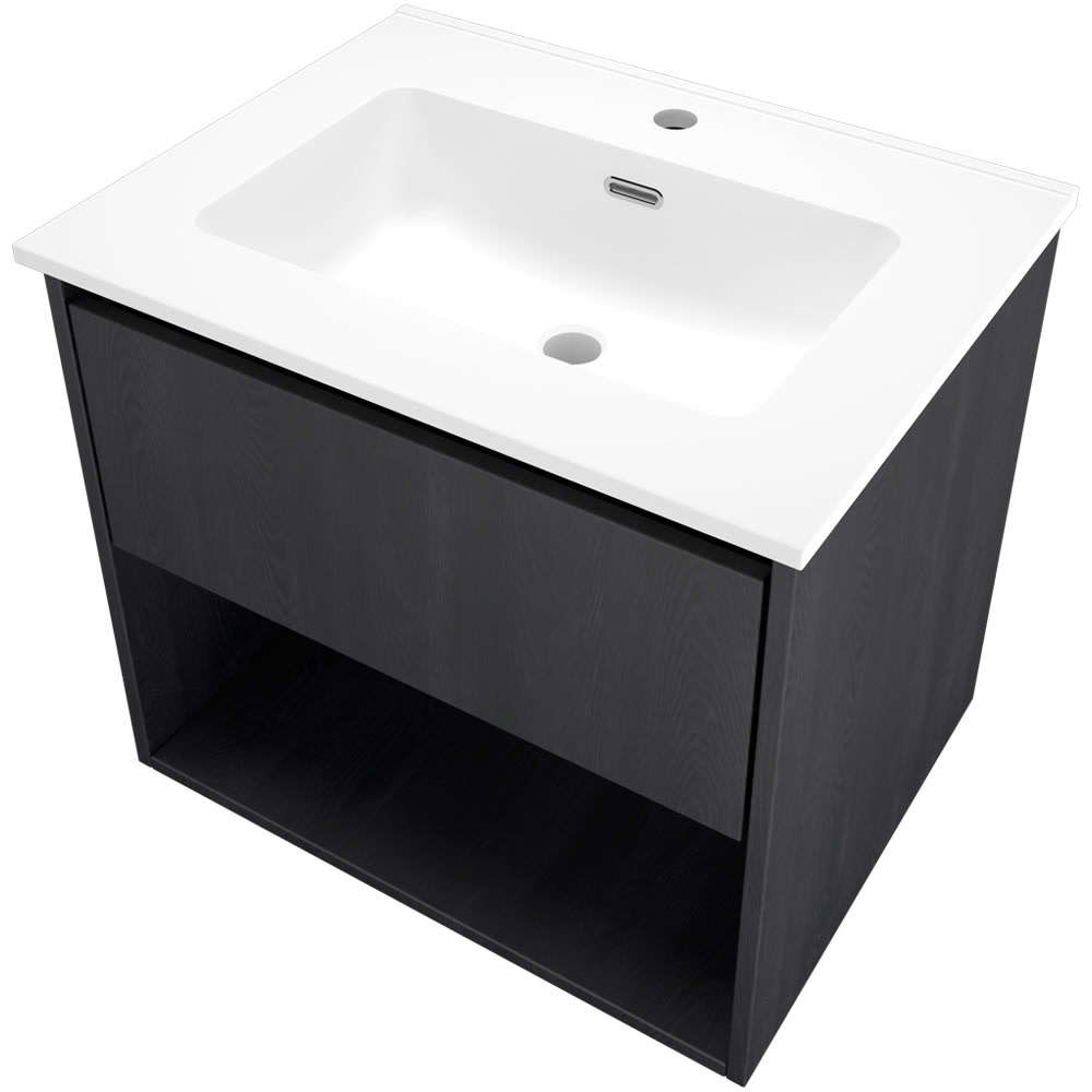 Sanibell Proline møbelsæt i sort eg med softclose skuffe, integreret greb og porcelænsvask m. hanehul. Leveres i 2 kolli.