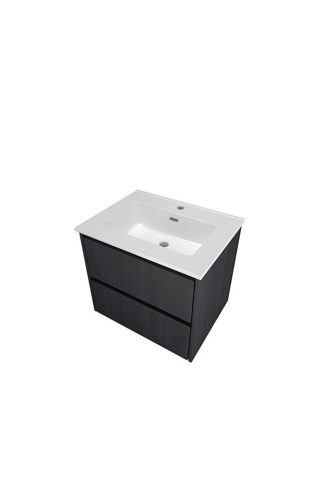 Sanibell Proline møbelsæt i sort eg med 2 softclose skuffer og porcelænsvask med hanehul. Mål: 61x46 cm. Leveres i 2 kolli.