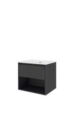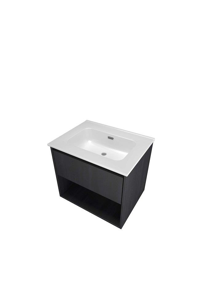 Sanibell Proline møbelsæt i sort eg med softclose skuffe, integreret greb og porcelænsvask uden hanehul. Leveres i to kolli.
