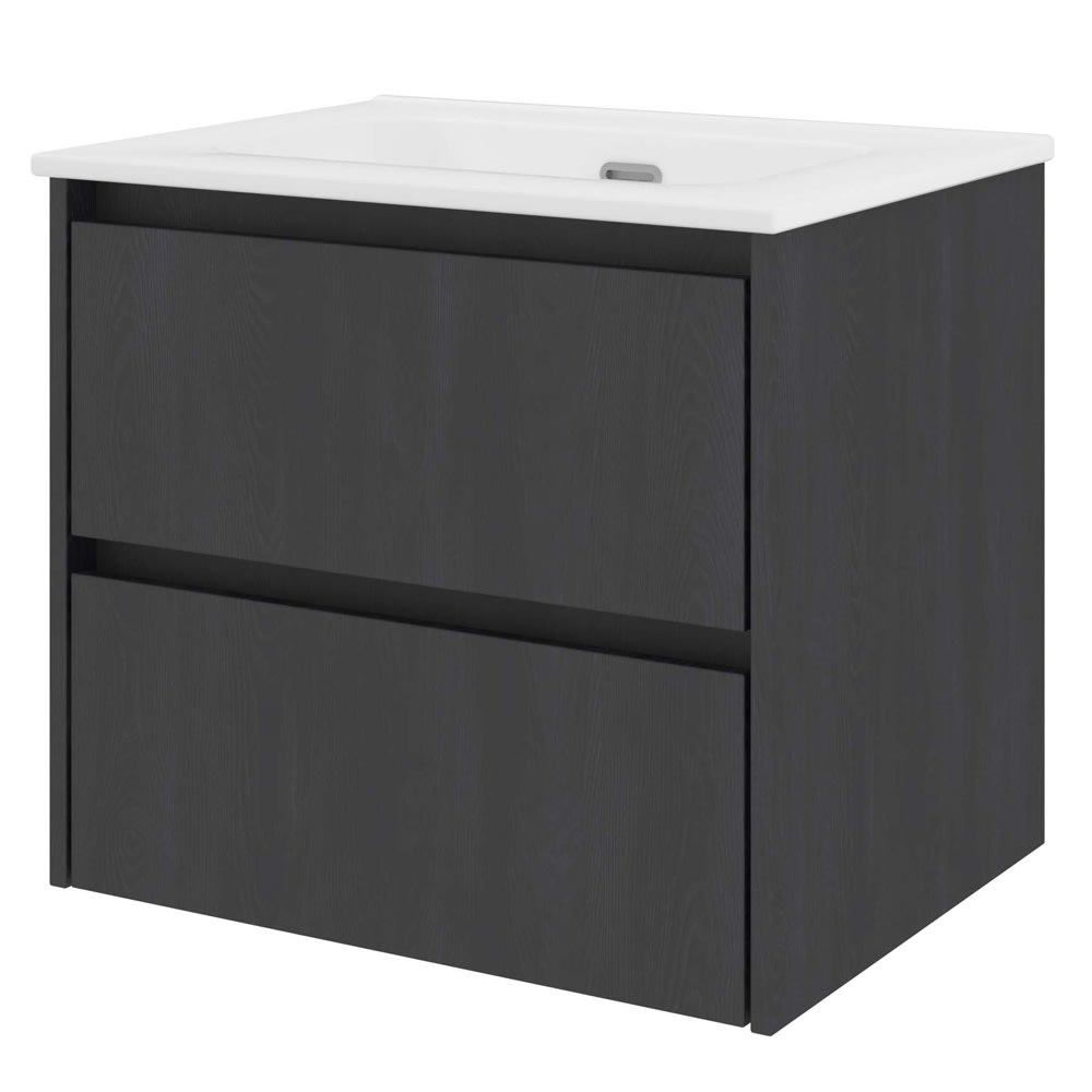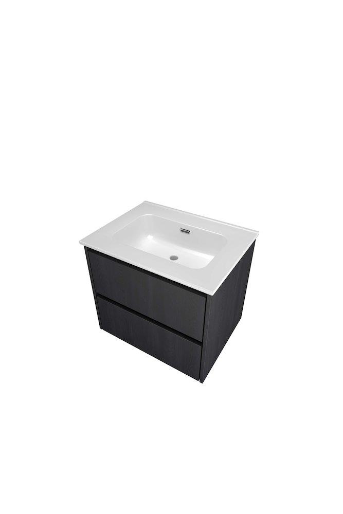 Sanibell Proline møbelsæt i sort eg. Sættet består af et skab med 2 softclose skuffer og en porcelænsvask uden hanehul. Mål: 61x46 cm.