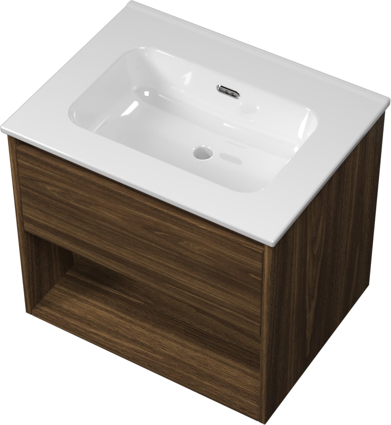 Møbelsættet er udstyret med en skuffe og en åben hylde, hvilket giver rigelig opbevaringsplads til badeværelsesartikler. Soft close funktionen sikrer en blød og lydløs lukning af skuffen, mens det integrerede greb bidrager til et minimalistisk udseende. Melamin overfladen gør møblet let at rengøre og vedligeholde.