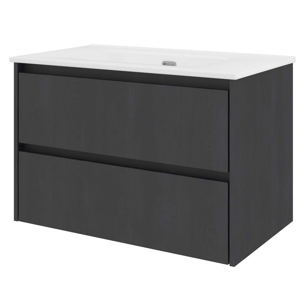 Sanibell Proline møbelsæt i sort eg med 2 softclose skuffer og porcelænsvask uden hanehul. Mål: 81 x 46 cm. Leveres i 2 kolli.