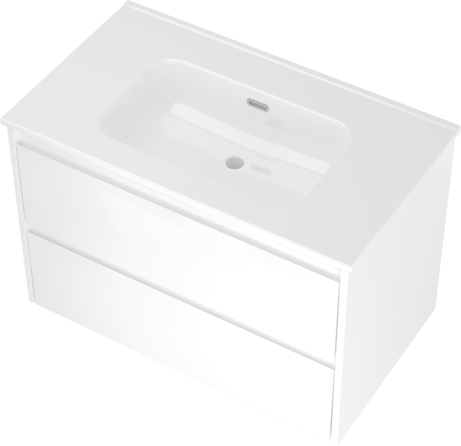 Møbelsættet er udstyret med to softclose skuffer, der sikrer en blød og lydløs lukning. Det integrerede greb bidrager til det minimalistiske design og giver et stilrent udtryk. Overfladen i hvid højglans er let at rengøre og vedligeholde, hvilket gør møbelsættet ideelt til det moderne badeværelse.