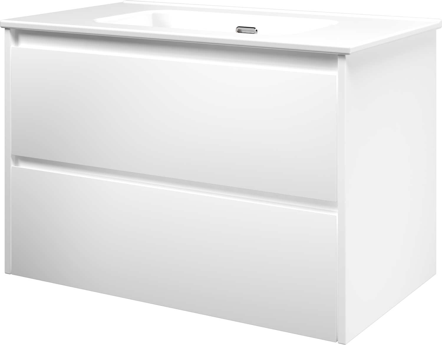Møbelsættet er designet med to softclose skuffer, der sikrer en blød og lydløs lukning. Den matte, hvide overflade tilføjer et elegant touch, mens det integrerede greb bidrager til et minimalistisk udseende.