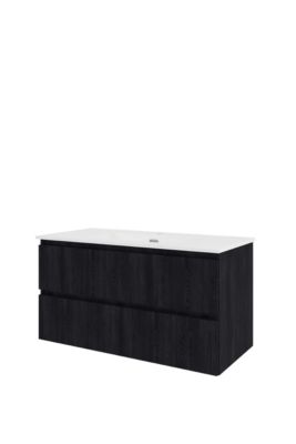 Sanibell Proline møbelsæt i kul eg med lodrette lameller. Inkluderer skab med 2 softclose skuffer og porcelænsvask med hanehul. Leveres i 2 kolli.