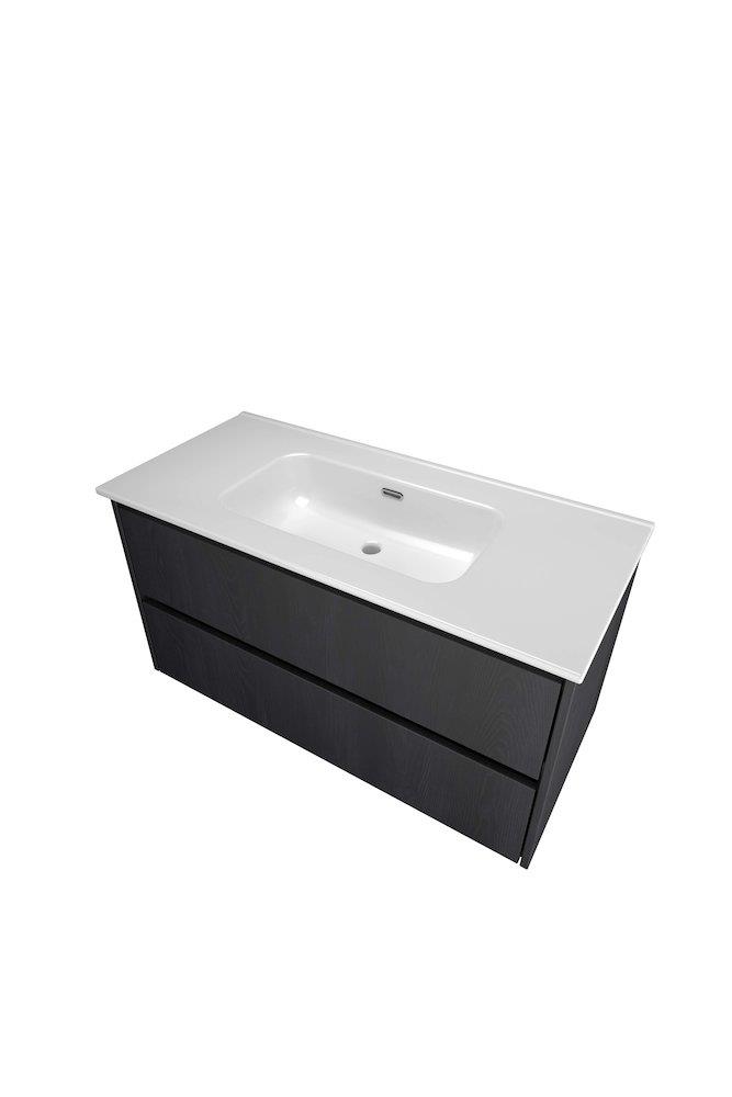 Sanibell Proline møbelsæt i sort eg, 101x46,8 cm. Inkl. skab med 2 softclose skuffer og porcelænsvask uden hanehul. Leveres i 2 kolli.