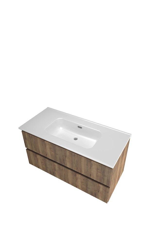 Sanibell Proline møbelsæt i terra eg med lodrette lameller. Sættet består af et skab med 2 softclose skuffer og en porcelænsvask uden hanehul. Leveres i 2 kolli.