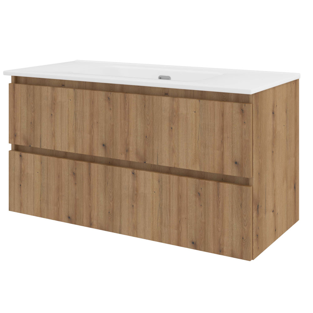 Sanibell Proline møbelsæt i urban eg med lodrette lameller. Sættet består af et skab med 2 softclose skuffer og en porcelænsvask uden hanehul. Leveres i 2 kolli.