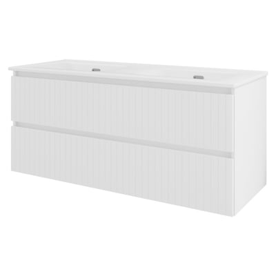 Sanibell Proline møbelsæt i hvid højglans med lodrette lameller. Består af skab med 2 grebsfrie softclose skuffer og dobbelt porcelænsvask uden hanehul.