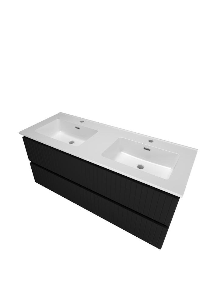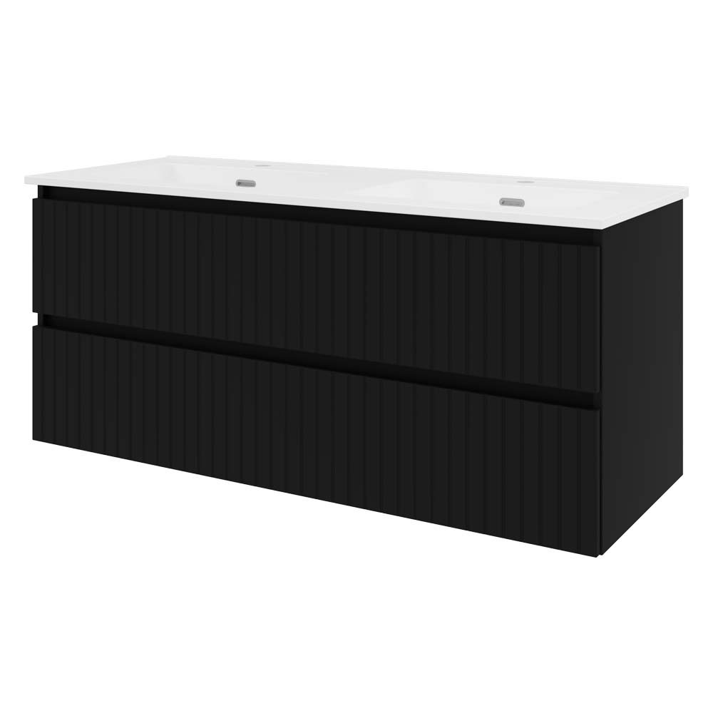 Sanibell Proline møbelsæt i 121x46,8 cm er lakeret i matsort og har et stilrent design med lodrette lameller. Møbelsættet består af et skab med to grebsfrie skuffer med softclose-funktion samt en dobbelt porcelænsvask med hanehul.