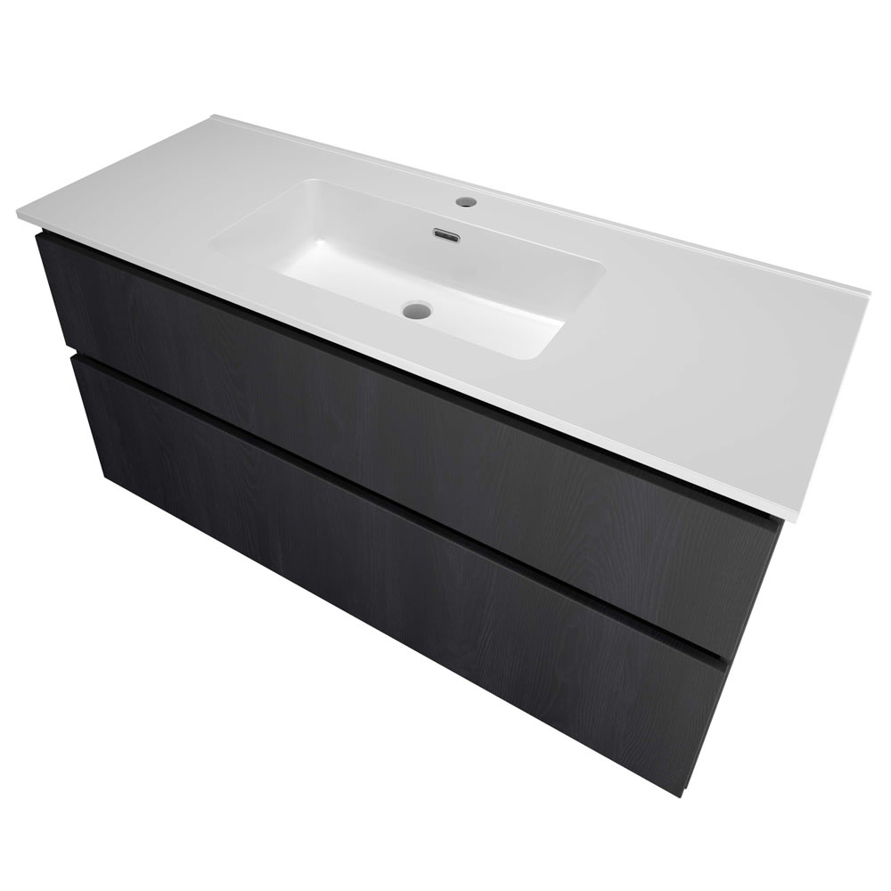 Sanibell Proline møbelsæt i sort eg med to softclose skuffer og porcelænsvask med hanehul. Mål: 121x46 cm.