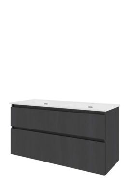 Sanibell Proline møbelsæt i sort eg, 121x46 cm. Med skab, 2 asymmetriske, grebsfrie softclose skuffer og dobbelt porcelænsvask med hanehul.