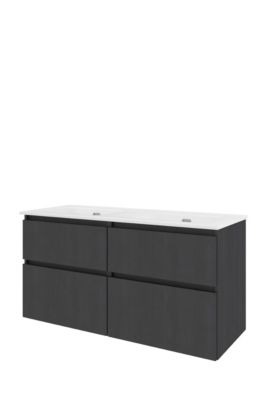 Sanibell Proline møbelsæt i sort eg, 121x46,8 cm. Skab med 4 asymmetriske, grebsfrie softclose skuffer og dobbelt porcelænsvask uden hanehul.