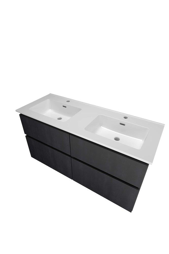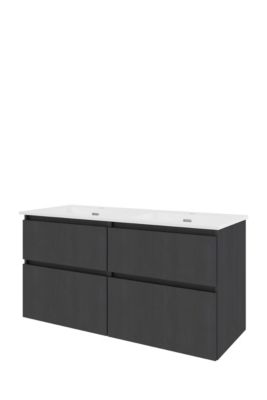 Sanibell Proline møbelsæt i sort eg, 121x46 cm. Med skab, fire softclose skuffer og dobbelt porcelænsvask med hanehul. Leveres i tre kolli.