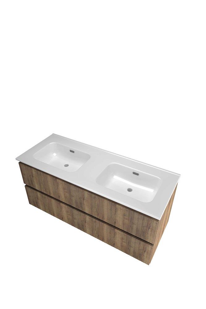 Sanibell Proline møbelsæt i terra eg med lodrette lameller. Inkl. skab med 2 grebsfrie softclose skuffer og dobbeltporcelænsvask uden hanehul. Mål: 121x46 cm.