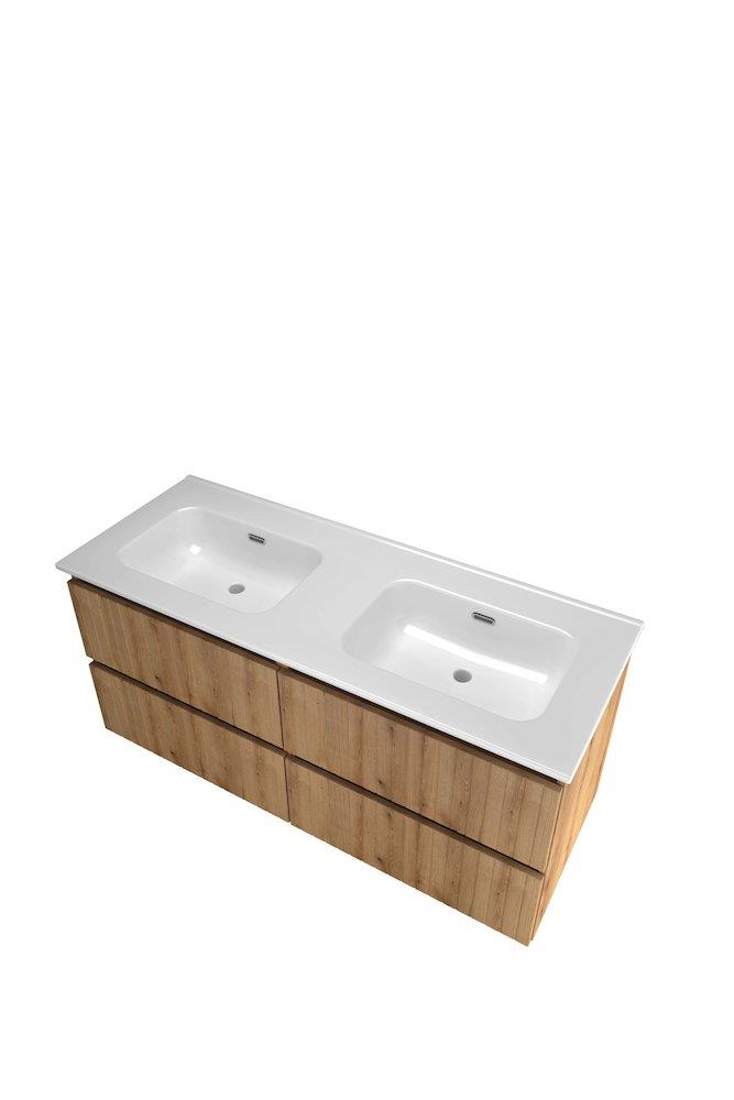Sanibell Proline møbelsæt i urban eg med lodrette lameller. Inkluderer skab med 4 grebsfrie softclose skuffer og dobbelt porcelænsvask uden hanehul.