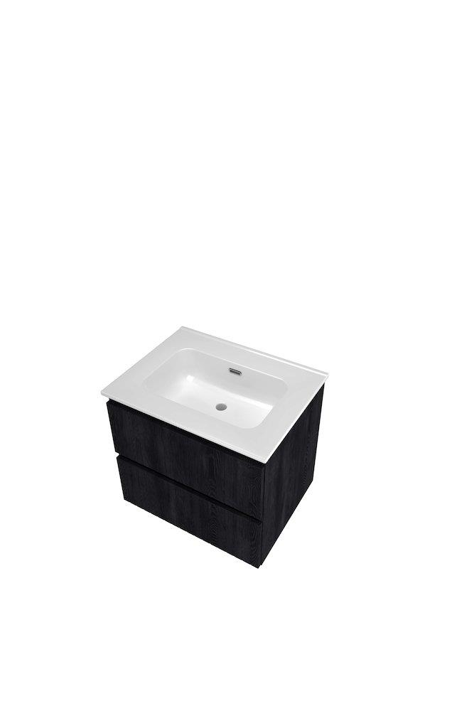Møbelsættet består af et underskab med to skuffer med softclose-funktion, der sikrer en blød og lydløs lukning. Den integrerede vask er udført i porcelæn og leveres uden hanehul, hvilket giver mulighed for at vælge et vægmonteret armatur eller et armatur til bordplade.