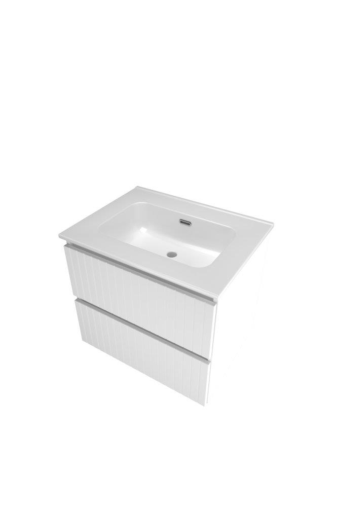 Sanibell Proline møbelsæt, 61x46 cm, i lakeret mathvid med lodrette lameller. Sættet består af et skab med 2 grebsfrie softclose skuffer samt en porcelænsvask uden hanehul.