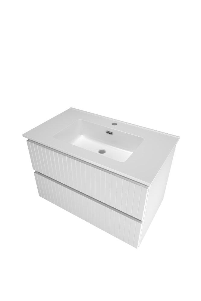 Sanibell Proline møbelsæt i 81x46 cm, udført i lakeret hvid højglans med lodrette lameller. Sættet består af et skab med 2 grebsfrie softclose skuffer samt en porcelænsvask med hanehul.