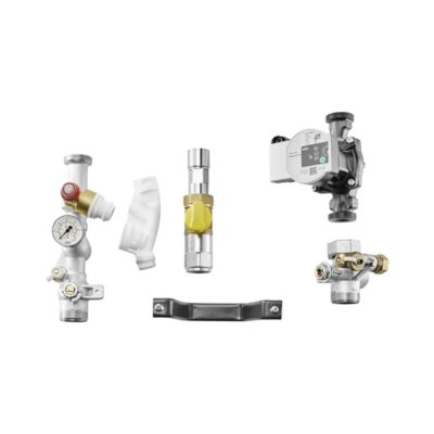 Pumpe tilslutningsgruppe til basisramme til enkeltkedler og kaskadeenheder. Passer til størrelserne 50-70 kW. Indeholder høj energieffektiv pumpe, sikkerhedsventil, gashane m.m.