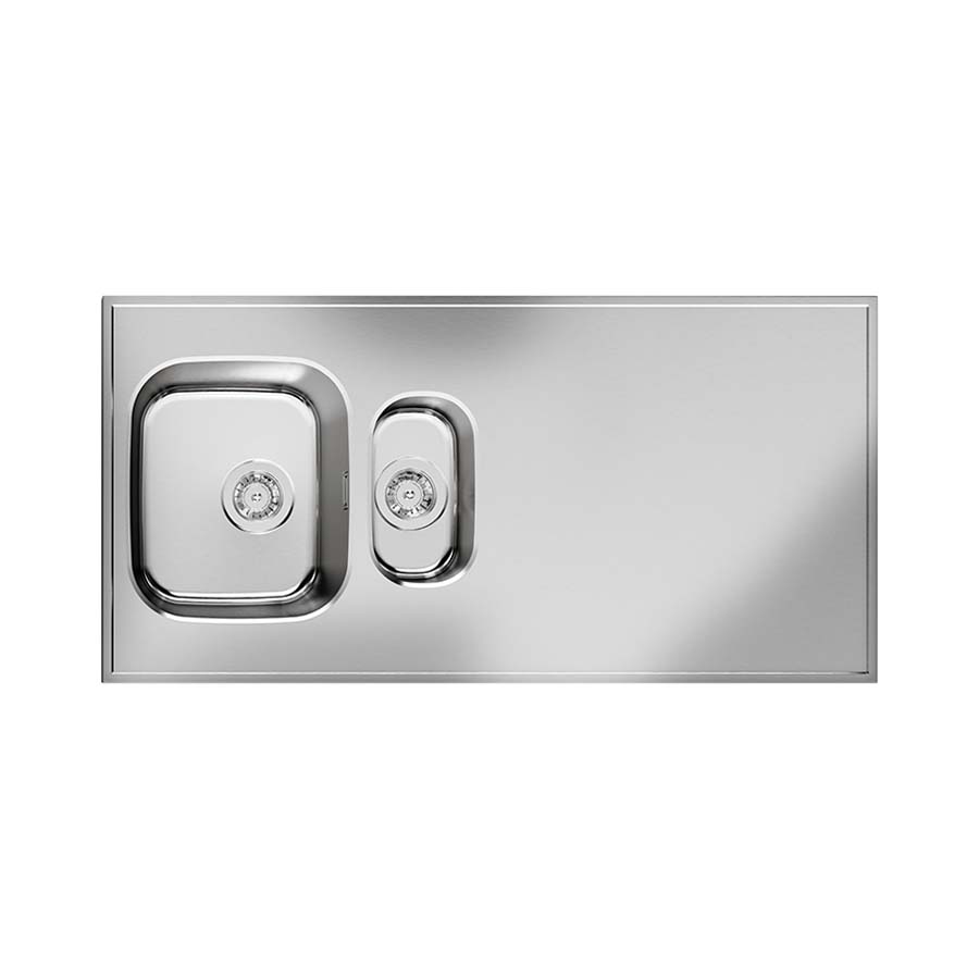 Vendbar bordplade med vask, der leveres komplet med bundventil. Vaskens mål er 340x400x180 mm + 160x290x120 mm. Bordpladen er designet til en skabsbredde på 60 cm, med udvendige mål på 1200x600x30 mm og et afløbsmål på 97 mm.