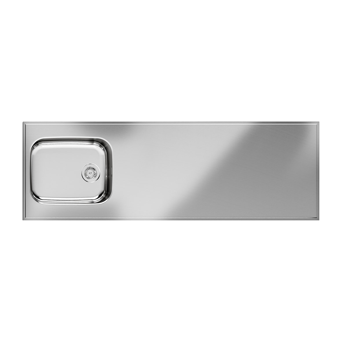 Vendbar bordplade i rustfrit stål med integreret vask (500x400x200 mm). Leveres med bundventil og er forberedt til hanehul. Mål: 1800x600x30 mm. Til skabsbredde på 60 cm.