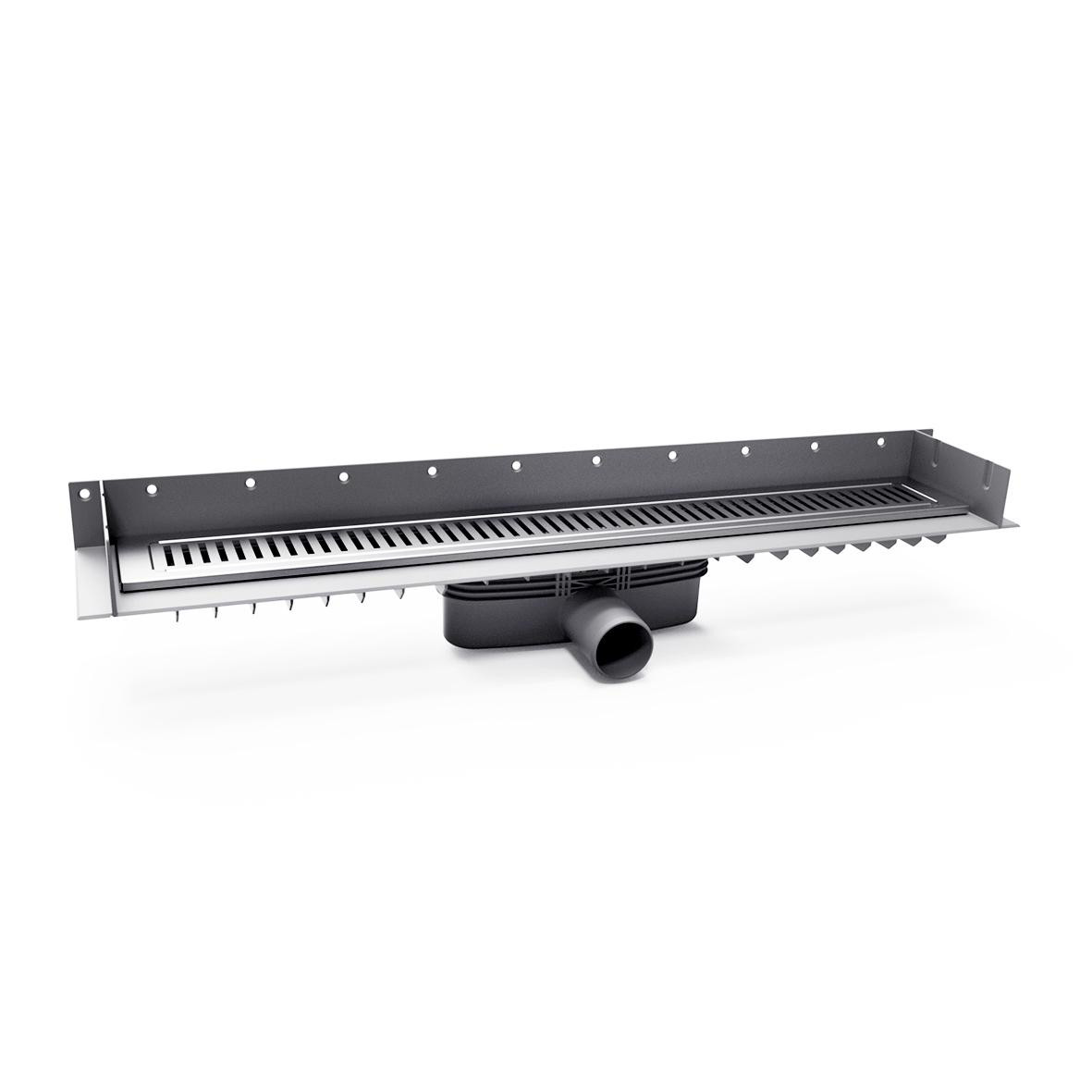 Purus Line sampak 1000 er en komplet afløbsrende med 50 mm lav vandret udløb, der er designet til montering i beton.
