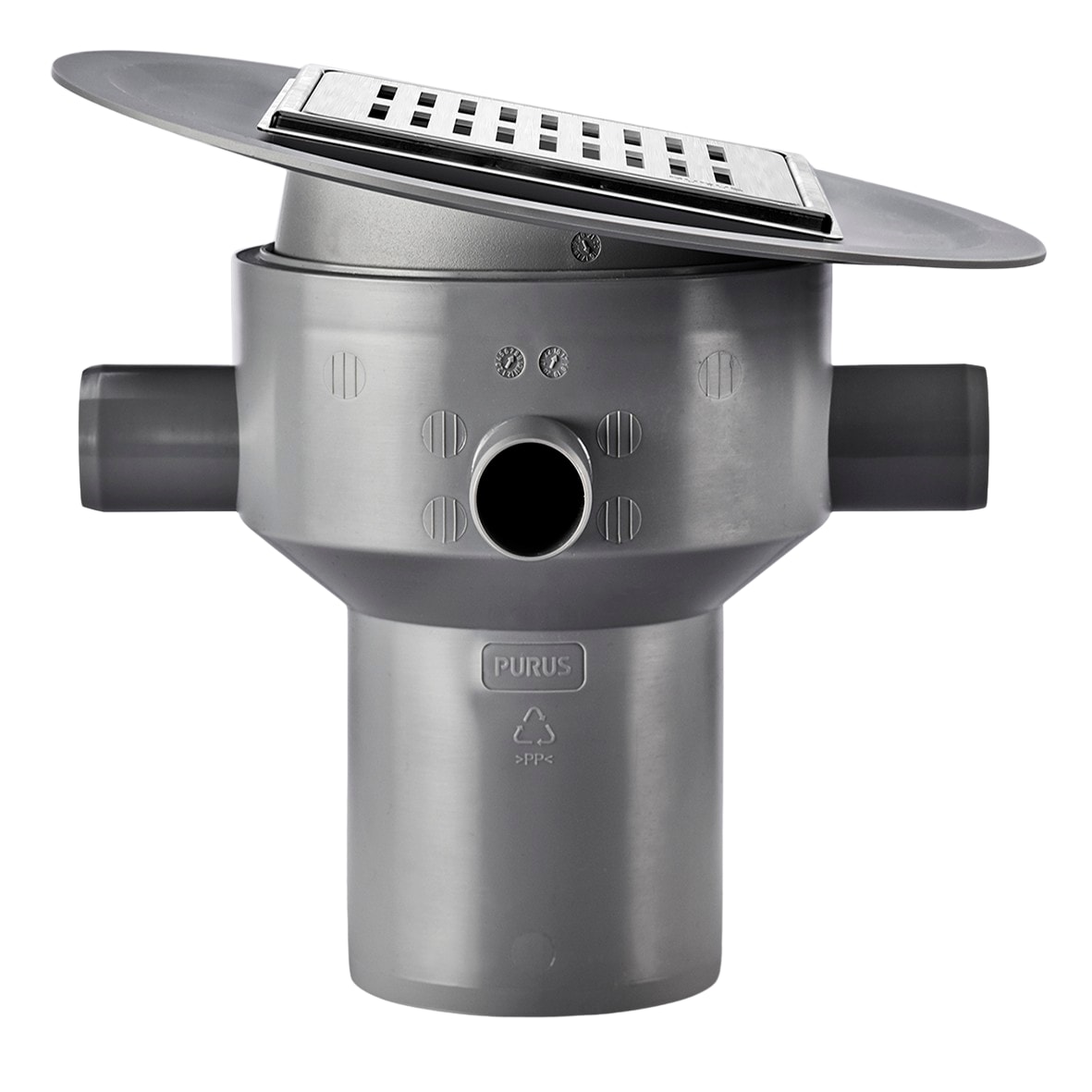 Purus Multiflex Ø110 mm lodret udløb med flange til smøremembran, 3 sideindløb. Rist/ramme til klinkegulv uden vandlås MaxiOne, VA-Godkendt. Til beton/klinkegulv.