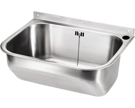 Purus udslagsvask i børstet rustfrit stål med spanderist, Ø102 mm udløb og monteringsbeslag. Mål: 470 x 470 mm. Væghængt model med vippe/aftagelig gitter.