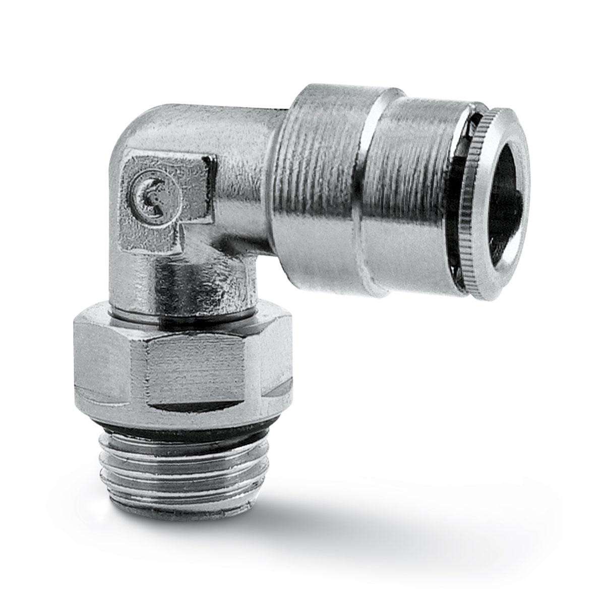 Denne push-in fitting er en swivel elbow model 6522 fra Camozzi. Den er designet til 5 mm tuber og har et M5 gevind.