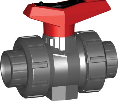 PVC kuglehane Type 546 med union for nem installation og demontering. Har 50 mm diameter, PTFE-tætning og integreret gevindbøsning. DN 40, PN 16.
