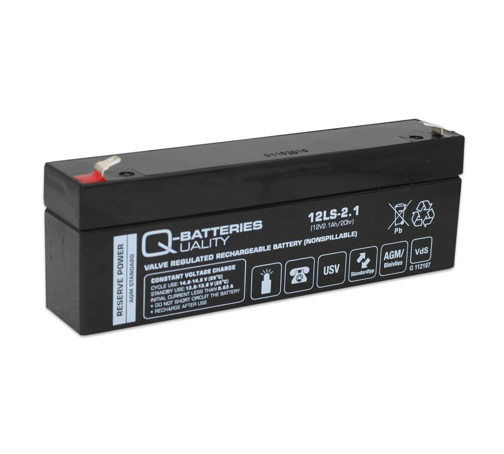 Q-Batteries 12LS-2.1 er et 12V 2,1Ah AGM batteri fra LS-serien. Batterierne er ventilregulerede og vedligeholdelsesfrie AGM-batterier (Absorbent Glass Mat-teknologi), som er udviklet specielt til standby-applikationer, såsom sikkerhedsteknologi, brandalarmteknologi og UPS. Batterierne er kendetegnet ved fremragende energilagringsegenskaber og stor pålidelighed. Batterierne har VdS-godkendelse til alle relevante størrelser.