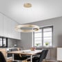 Elegant Q-Vito LED pendel i messing med justerbart hvidt lys og dæmpningsfunktion via fjernbetjening og app.