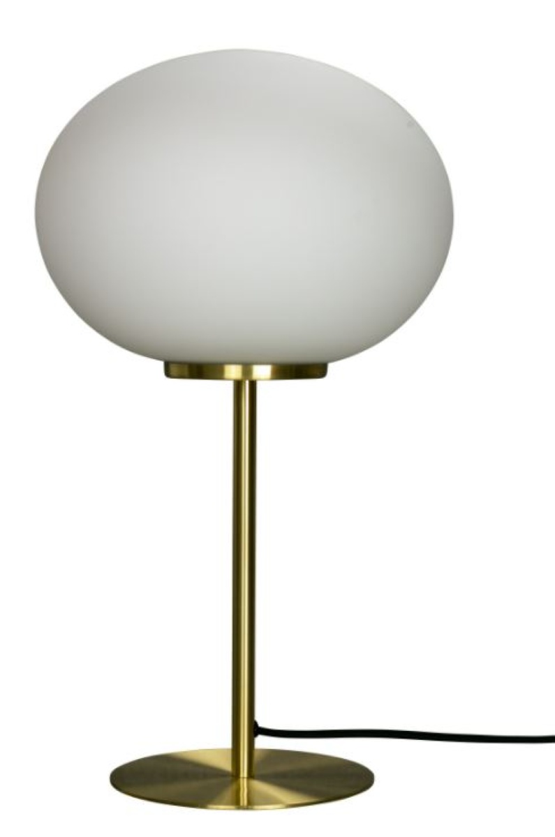Moderne bordlampe i klassisk design med oval Opal glasskærm, messing base og stofledning.