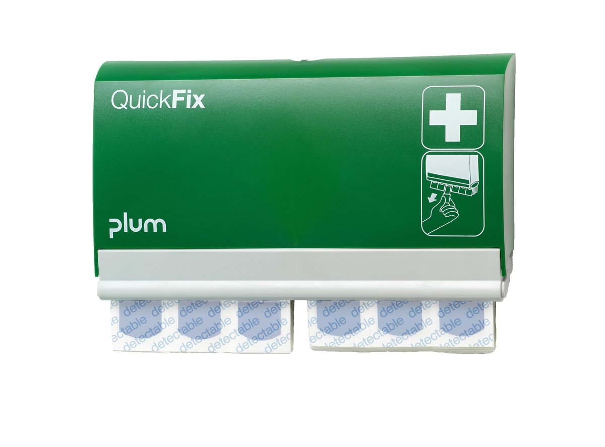 QuickFix Plaster dispenser med detectable plastre. Sterile, iøjnefaldende blå plastre med indbygget metalflade, der kan spores af metaldetektor. Åndbart og vandfast PE-materiale.
