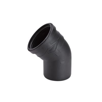 Sort lyddæmpende afløbsbøjning med en enkelt muffe. Fremstillet af PP-MD, der sikrer akustisk lydisolering. Testet af Fraunhofer og godkendt til brandklasse B2.