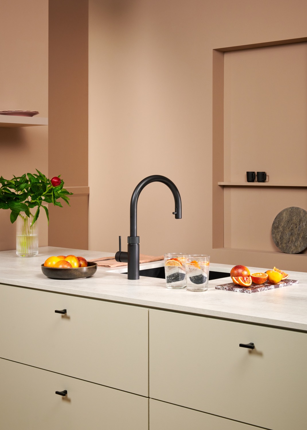 Quooker Flex Round i sort. En fleksibel og elegant løsning til dit køkken, der kombinerer varmt og koldt vand med kogende vand.