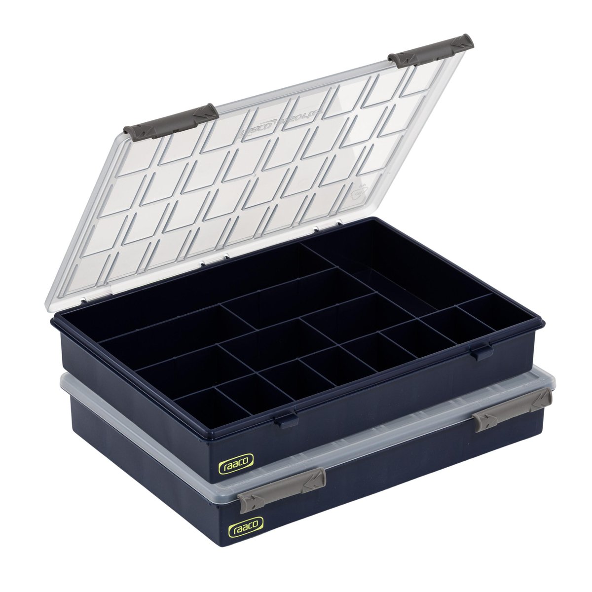 Effektiv sortimentsæske fra Raaco med 15 faste rum. Udstyret med U-profiler i låget, der holder indholdet sikkert på plads under transport. Fremstillet af robust polypropylen (PP).
