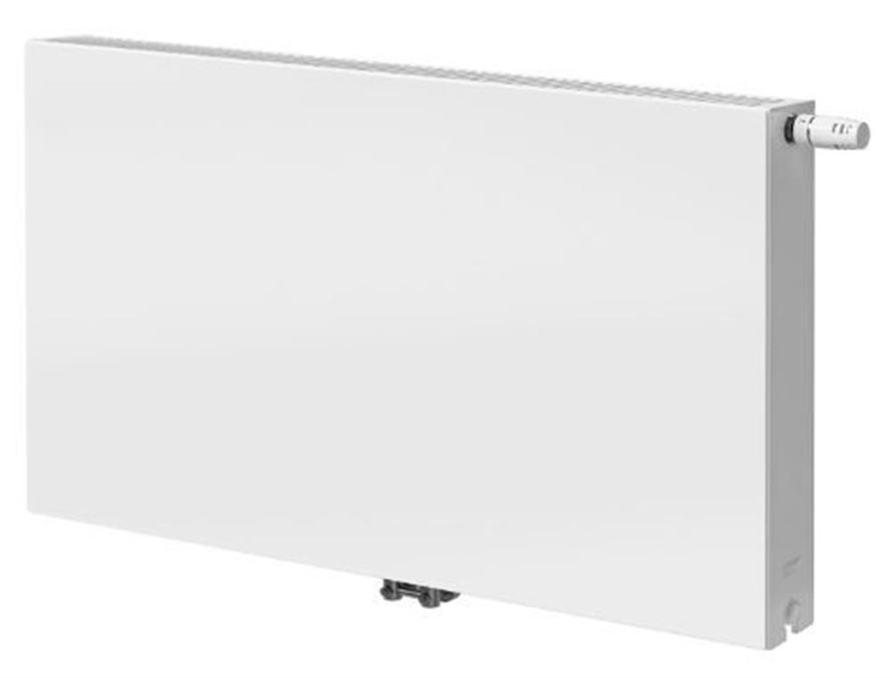 Purmo Compact Ventil Flex Plan (FCVF) er en stål panelradiator med glat frontplade og midteranboring. Denne model har fremløb til venstre.