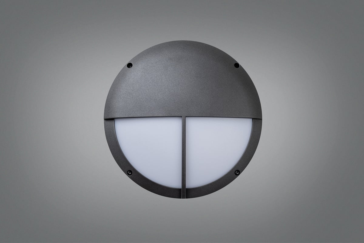 Ragner rundt vægarmatur med E27 sokkel. Kan monteres ude og inde. Udført i trykstøbt pulverlakeret aluminium og UV-stabiliseret opal polycarbonat.