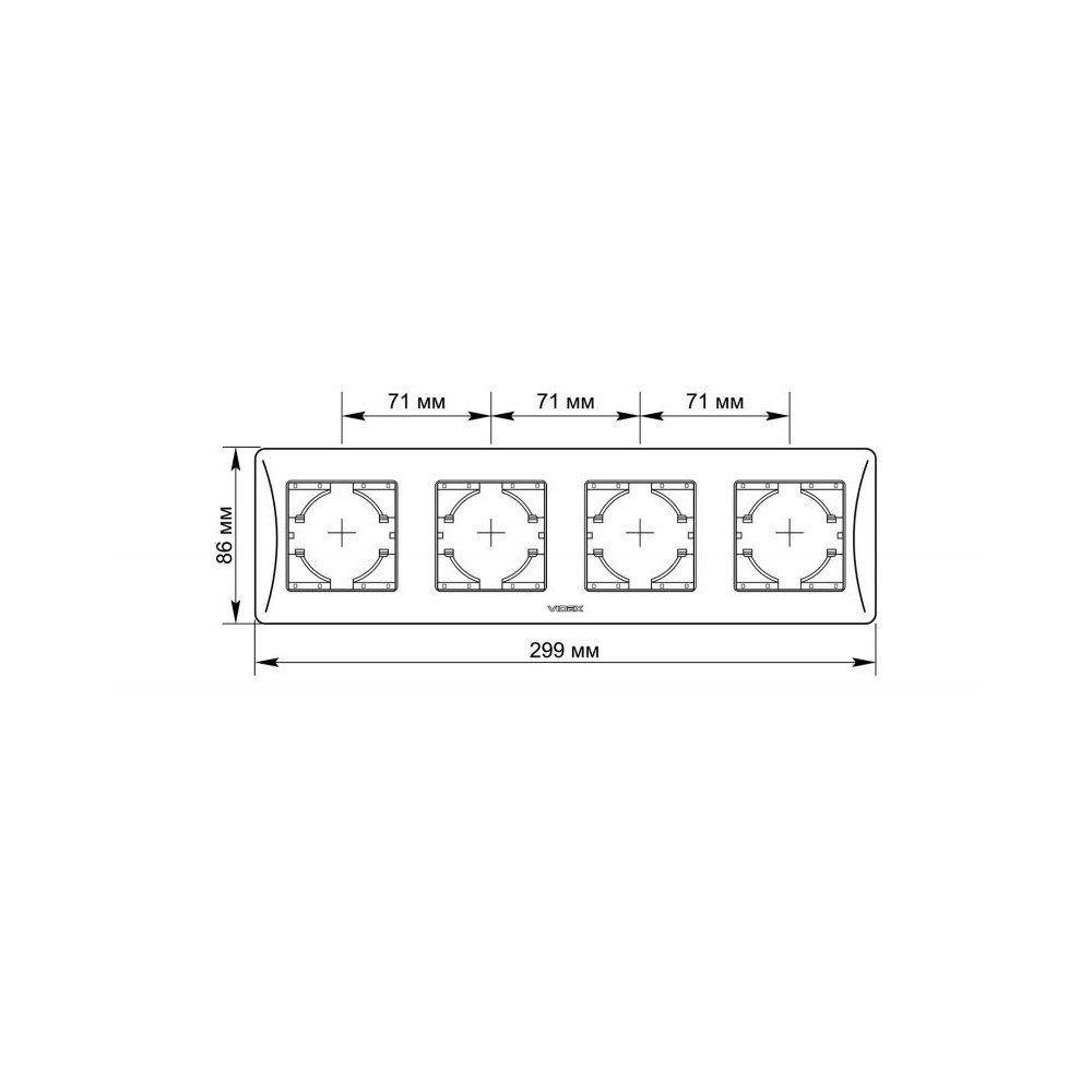 En 4-vejs horisontal ramme i hvid til montering af el-udtag. IP20 klassificeret og måler 299 x 86 x 9 mm.