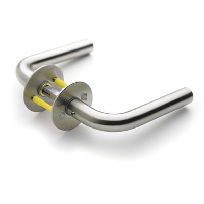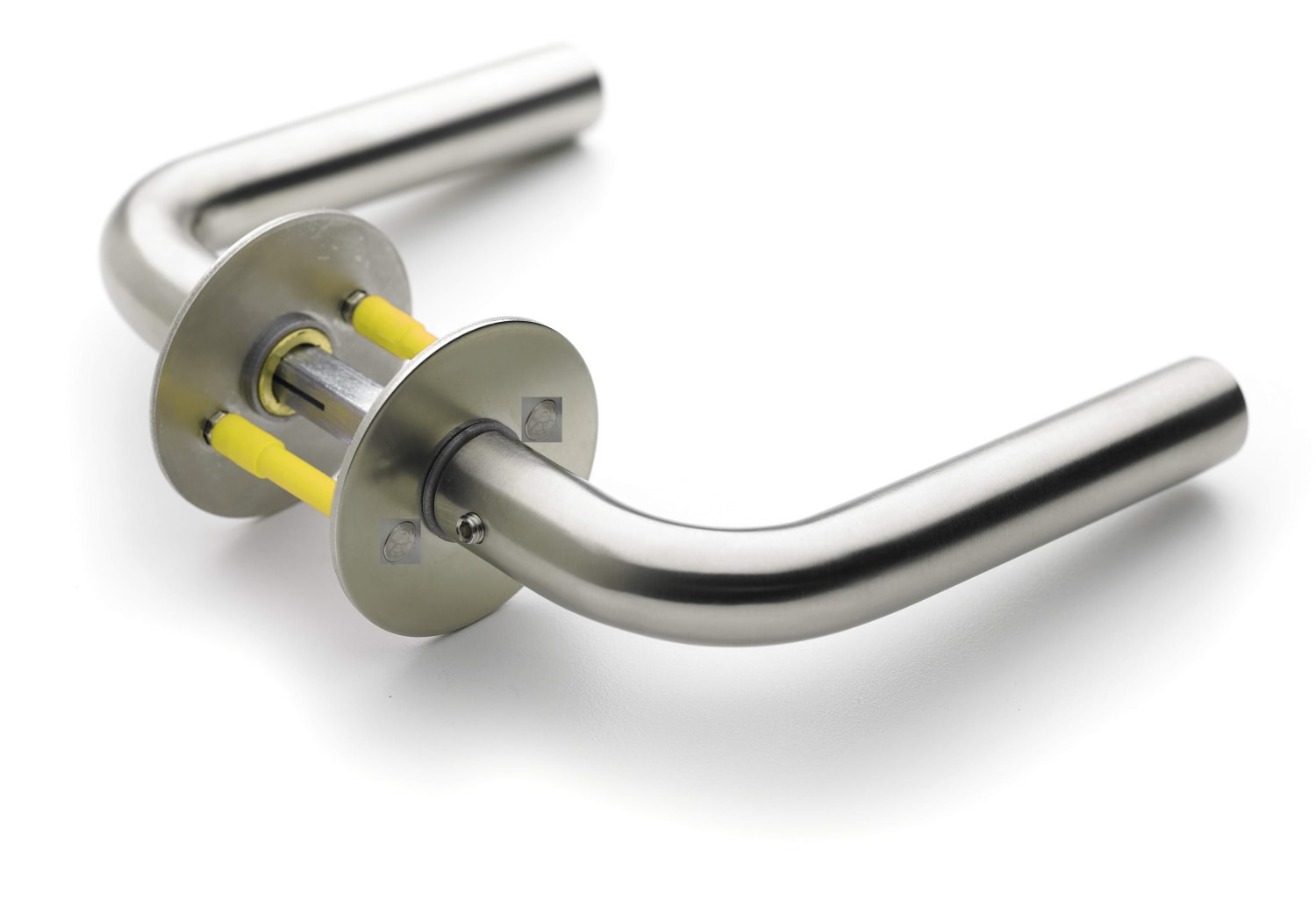 Dørgreb L-form Ø18 mm i matbørstet rustfrit stål (AISI 304). Monteret med massive rosetter i 2 mm. Dørgrebspind 8x8 mm medfølger. Til dørtykkelse 40-65 mm.