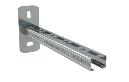 Skinnekonsol med vægbeslag og CO2 svejset C-profil. Ideel til ophængning af rør og kabelbakker på vægge og lofter. Med kontinuerlig centimetermål.