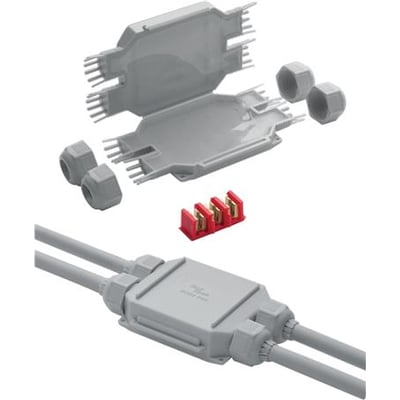 Raytech samledåse med gel, 105x65x25 mm, med klemme, 3x4 mm². IP68 og IP69K, klar til brug og ekstrem kompakt. Leveres med forskruning for at undgå unødig træk i kabel.