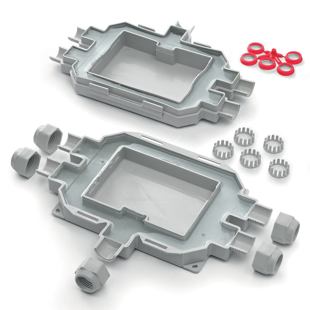 Raytech samledåse med gel. Ideel til udsatte miljøer, sikkerhedssystemer og videoovervågning. Nem adgang for vedligeholdelse.