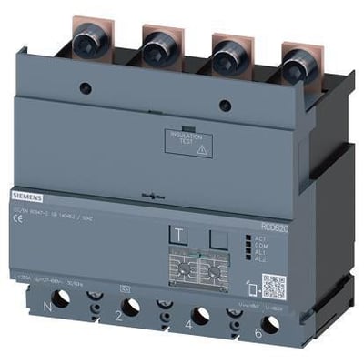 Avanceret RCD type A fejlstrømsenhed RCD820 fra Siemens. Last side monteret med nominel fejlstrøm 0.03...30A.