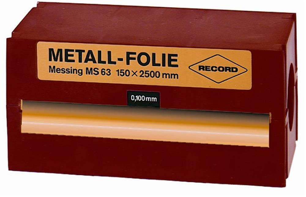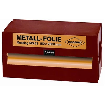 Metalfolie i messing, leveres i kunststofbokse der kan stables. Dimensioner: 150x0,075mm og 2,5 meter lang.