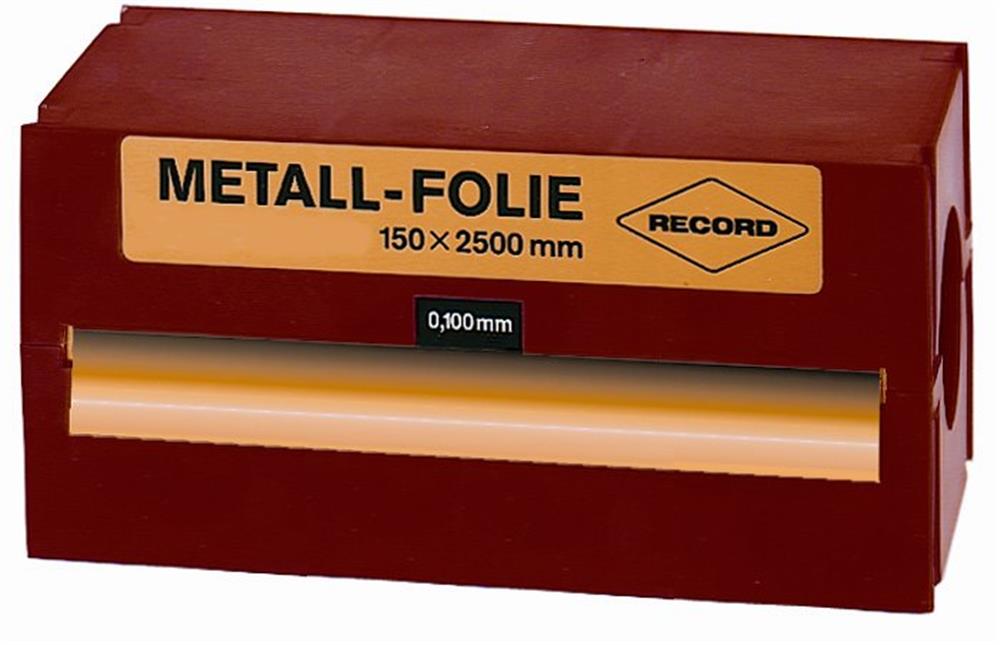 Metalfolie i kunststofbokse, der kan stables. Dimensioner: 150 x 0,15 mm og 2,5 meter lang.