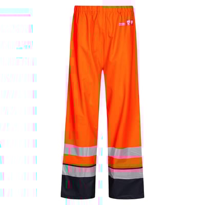Flammehæmmende hi-vis regnbukser i slidstærk PU-kvalitet. Vind- og vandtætte med reflekser for øget sikkerhed.