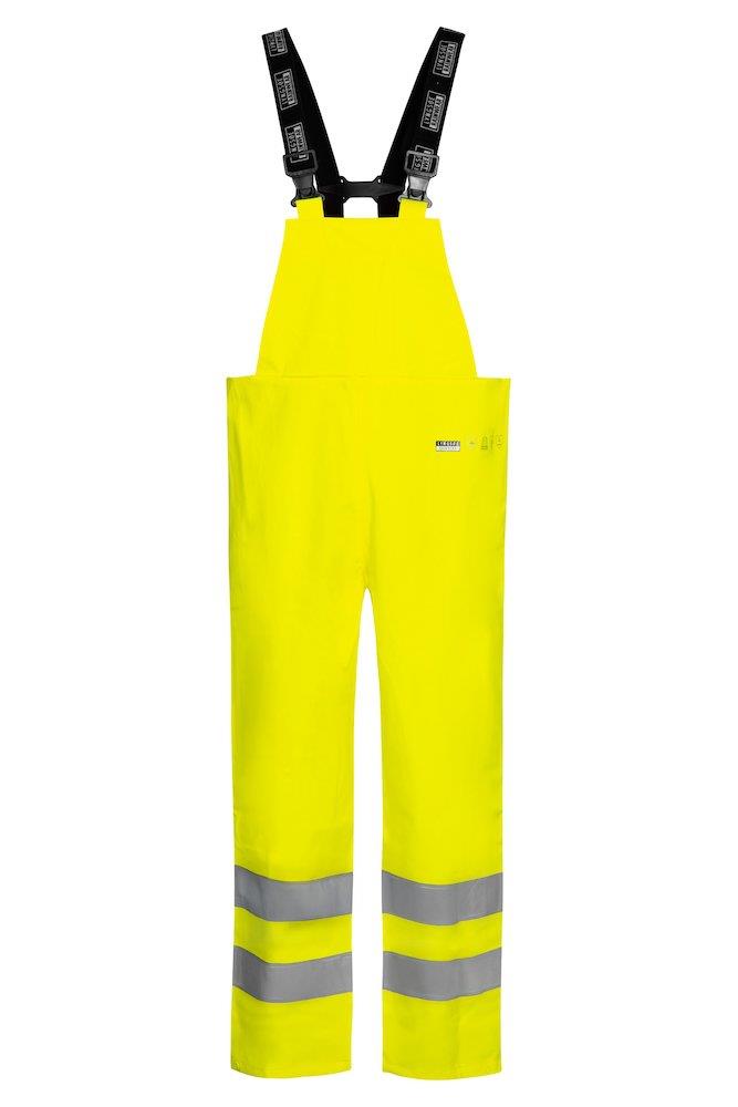 Brandhæmmende hi-vis regnoverall i 100% polyester med PU belægning. Vandtæthed: >20.000 mm. Med justerbare seler og trykknapjustering ved ankler.